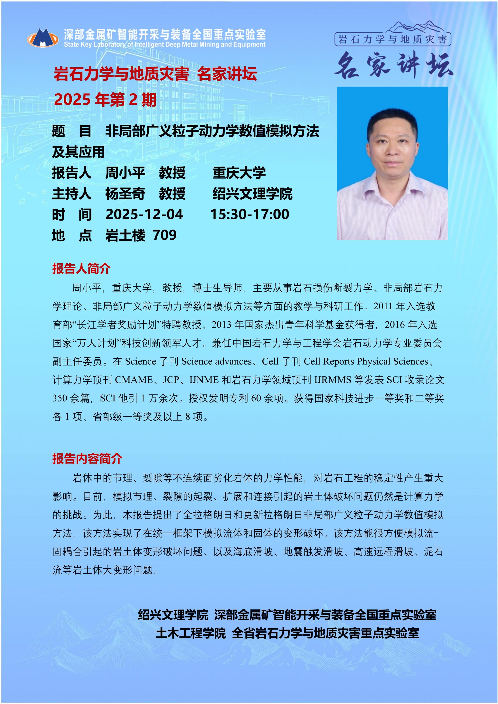 报告人:周小平 教授 时间:2025.12.04 15:30-17:00 地点:岩土楼709