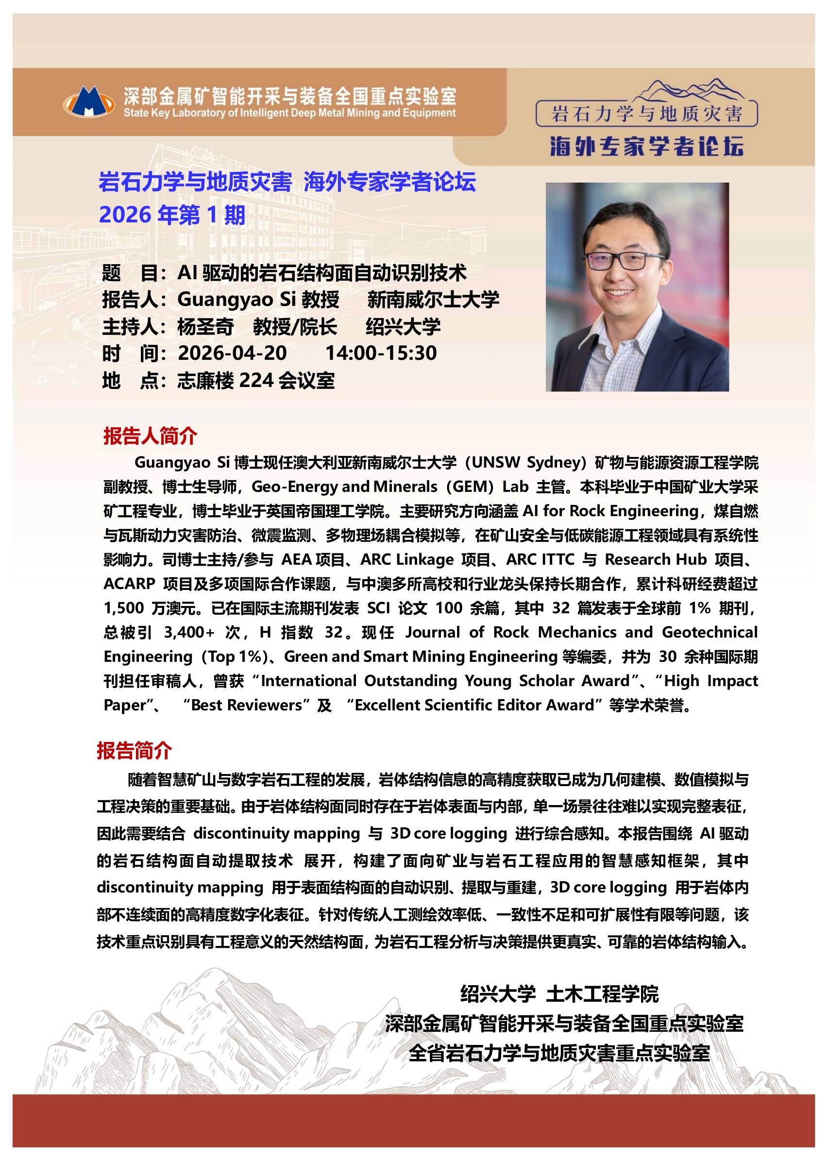 报告人:Guangyao Si 教授 时间:2026-04-17 9:00-10:30 地点:志廉楼224会议室
