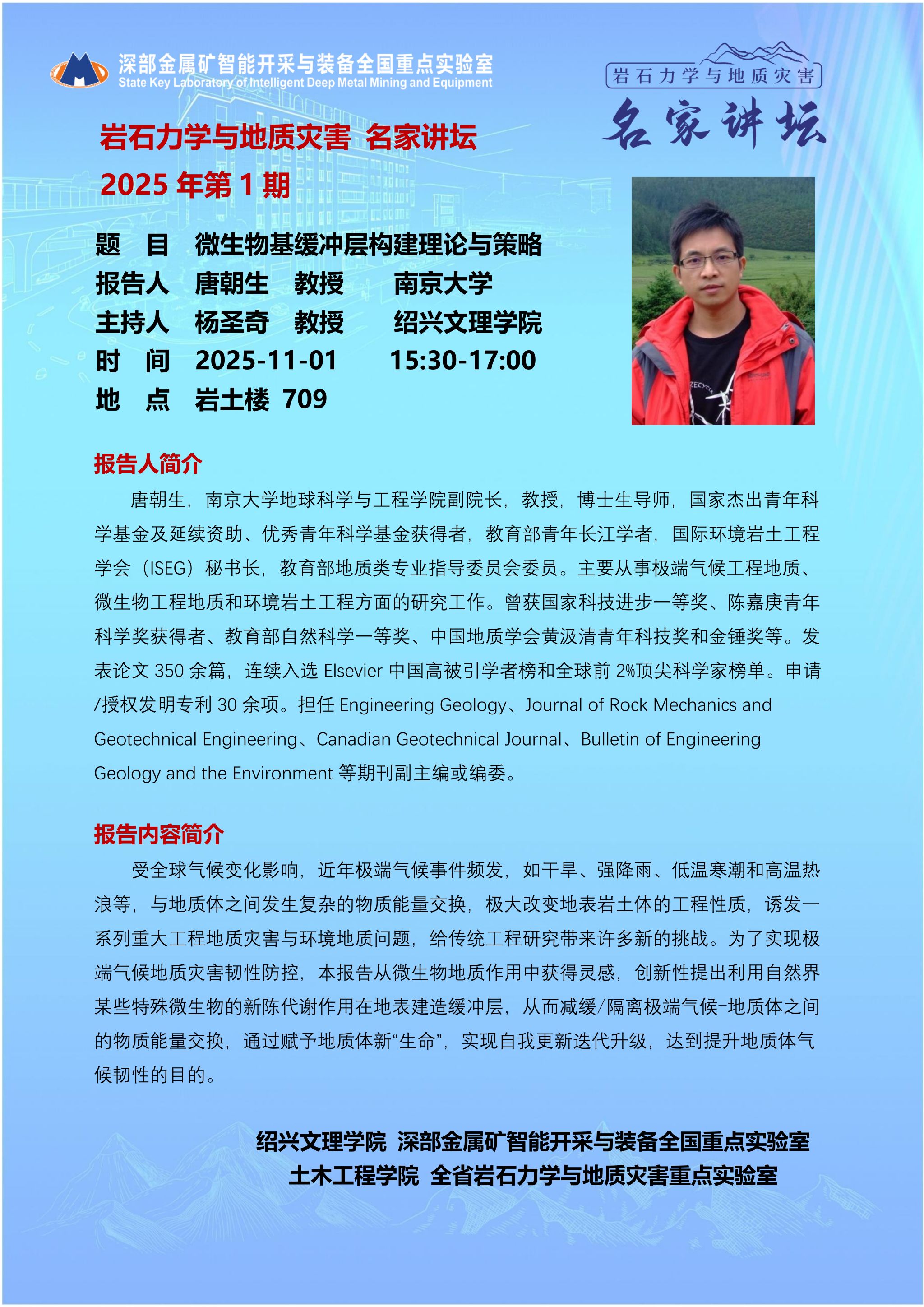 报告人:唐朝生 教授 时间:2025.11.01 15.30-17:00 地点:岩土楼709