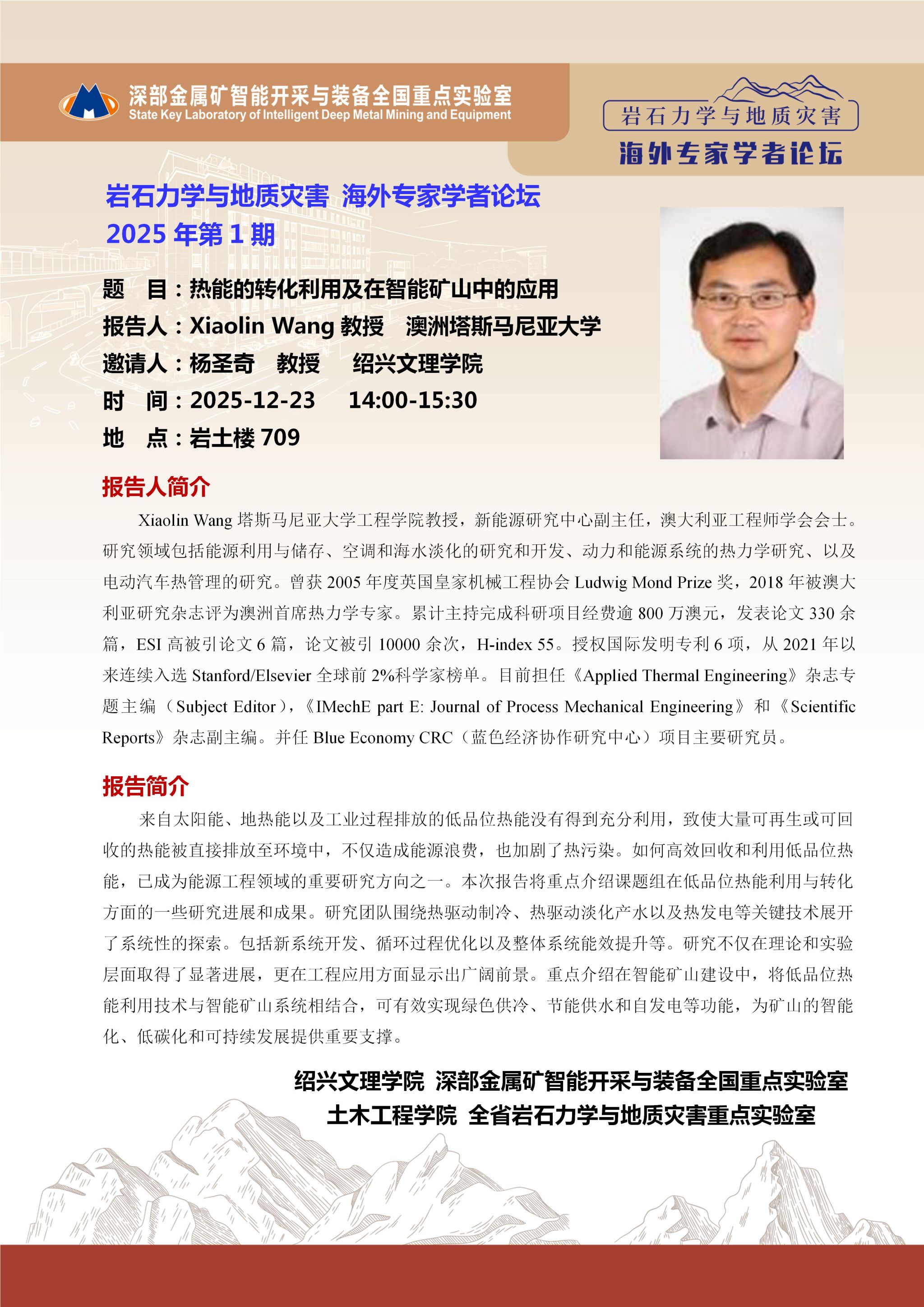 报告人:Xiaolin Wang教授 时间:2025-12-23 14:00-15:30 地点:岩土楼709